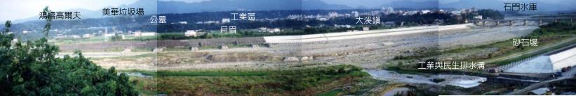 這樣的溪水茍延殘喘的流到大溪鎮來,大溪鎮也不是能讓溪水易過關的,大溪鎮分為東岸與西岸,人口約有八萬餘人,尤其在東岸更是人口稠密,以上附圖便是東岸,有墳場.高爾夫球場.垃圾場.大量人口和兩個工業區,很精采吧?!