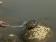 從這隻烏龜的頸部花紋得知,這是隻巴西烏龜,我在想該把他宰了還是要放生?